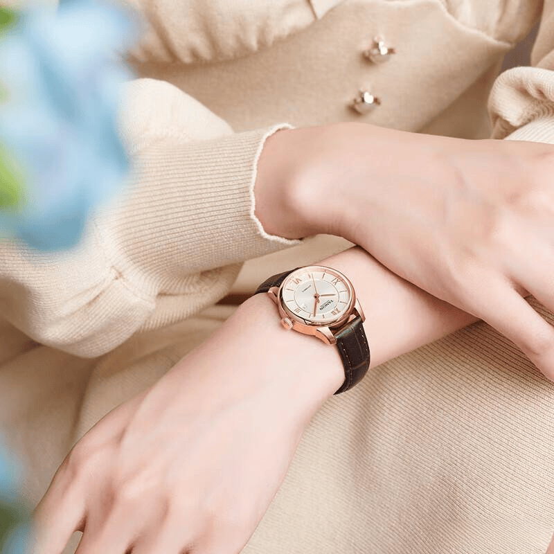 选用优良材料制做,内置石英机芯,温润的玫瑰金色取高雅棕色交互辉映,完满契合逃求简单美学的消费者。能完满融入多种场所,